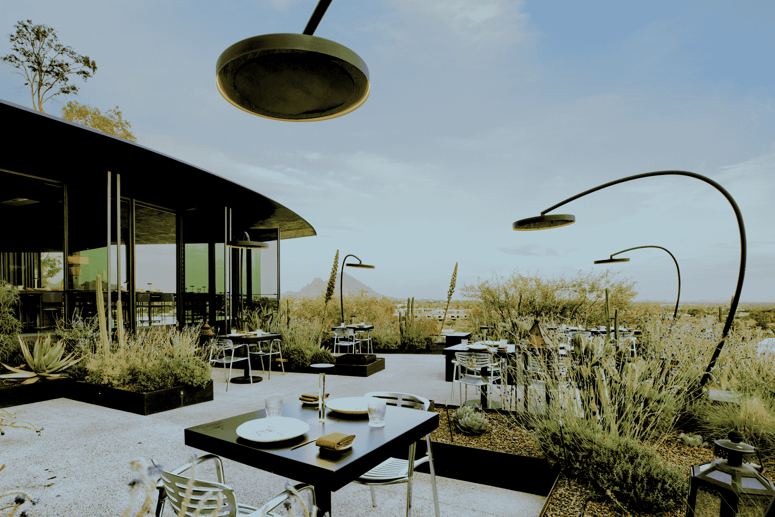 Wendell Burnette, der seit über 26 Jahren ein eigenes Architekturbüro im Arizona Valley betreibt, war sofort klar, dass das Restaurant eine Außenterrasse haben musste, um den Kundenwünschen gerecht zu werden – und dazu brauchten sie eine Heizmöglichkeit. „Ohne das passende Heizgerät konnten wir die Terrasse nicht realisieren, so einfach war das“, erinnert sich Wendall.
